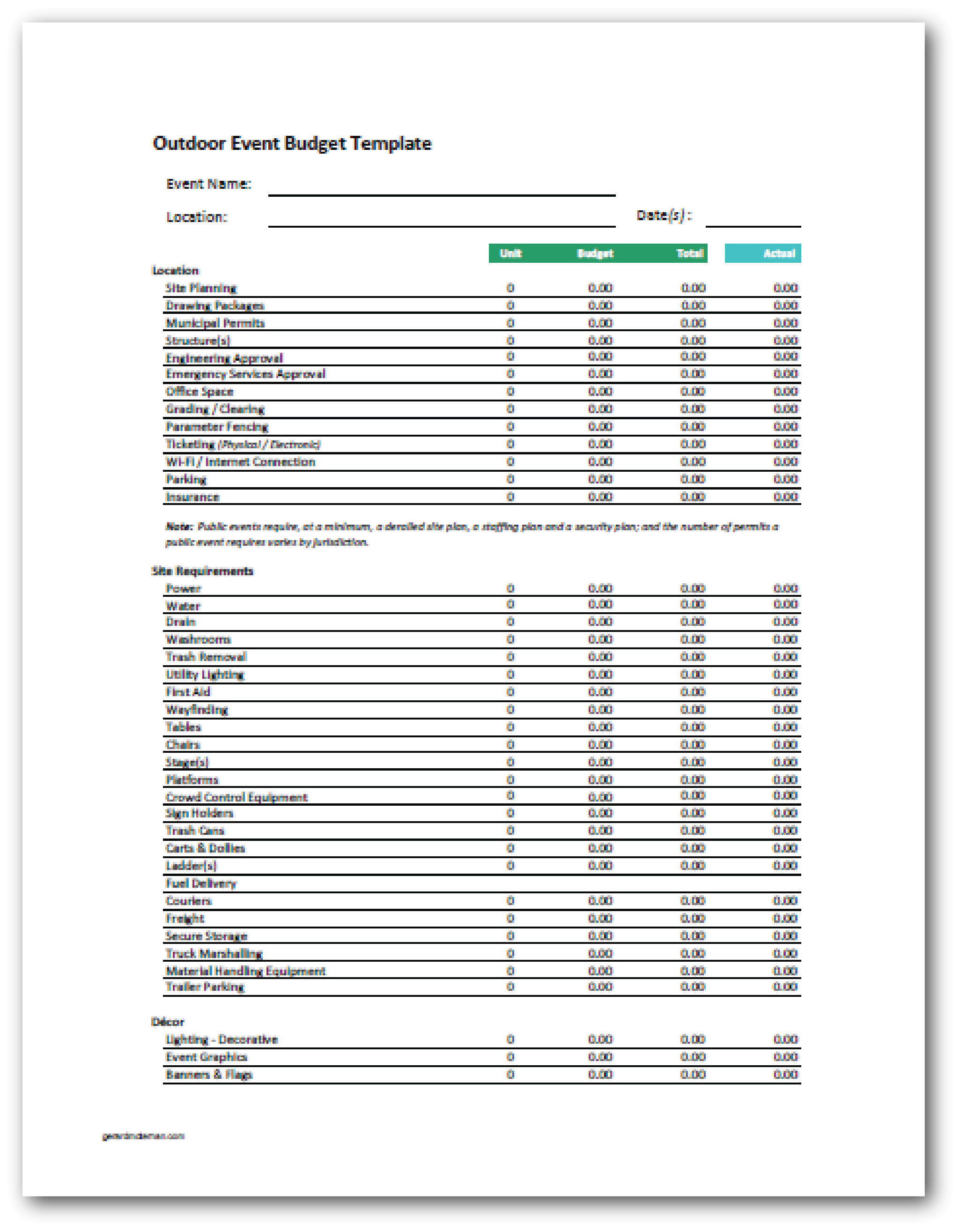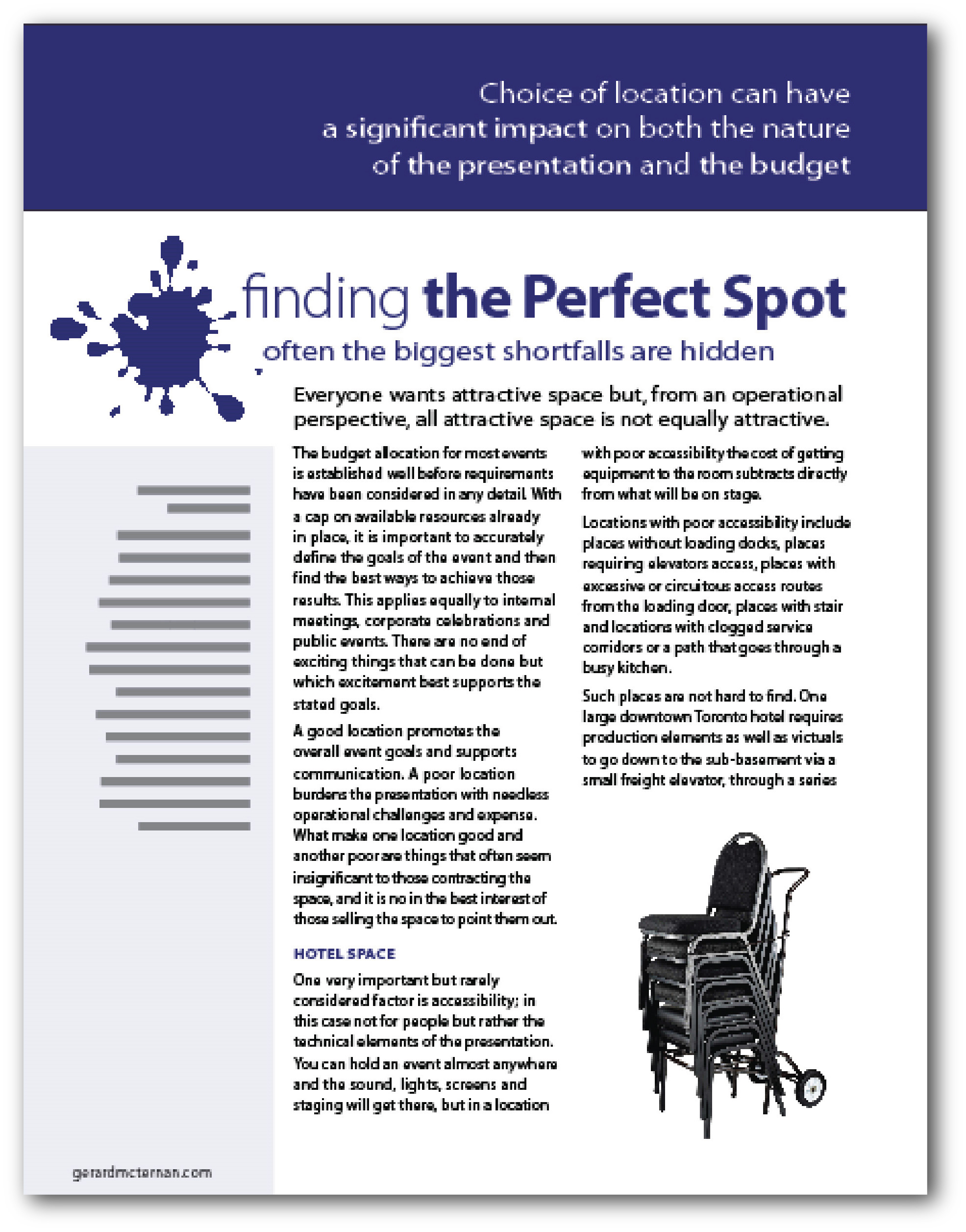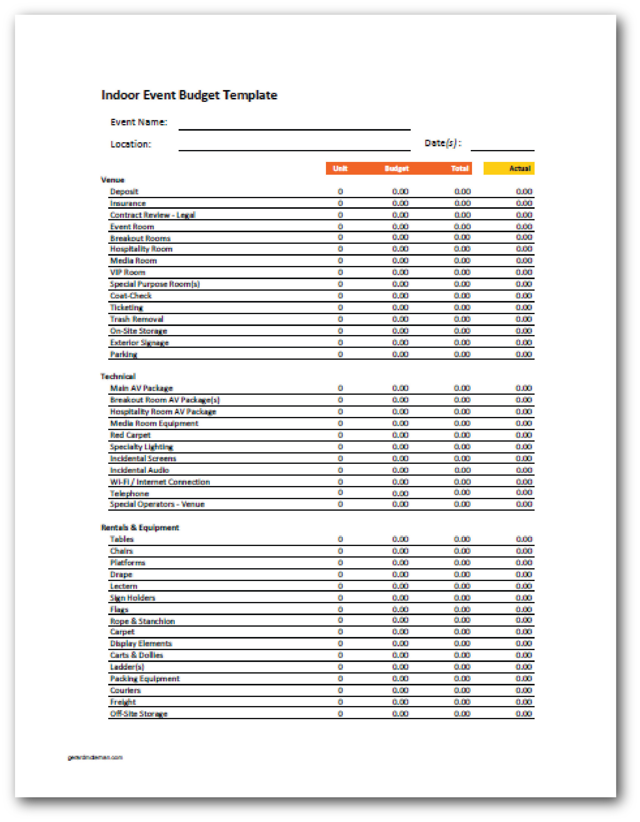 Where do you want to be? As the old saying goes, "if it's not on the page, it's not on the stage." The only way to ensure predictable results is through meticulous planning. That starts with a crystal clear definition of what the project is, what it is intended to achieve and, possibly most importantly, what success actually looks like. Many assume the answers to these questions are obvious however defining them in detail, in writing, galvanizes the effort. Below is a 'location' overview as well as an indoor and outdoor budget template. Presentations and events come in all sizes and shapes, of course, so these should be modified as required.